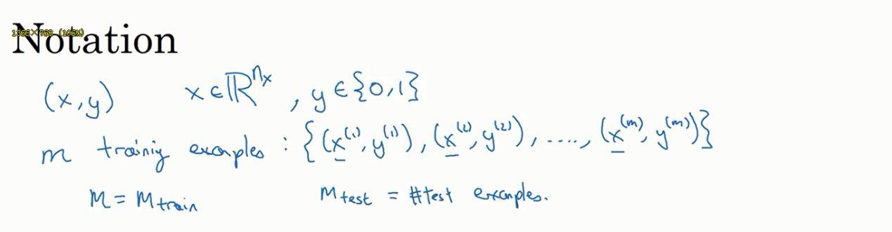 接下来我们说明一些在余下课程中,需要用到的一些符号。用一对(x, y)来表示一个单独的样本,x 代表 n x 维的特征向量,y 表示标签(输出结果)只能为 0 或 1。 而训练集将由 m 个训练样本组成 ,其中(x (1) , y (1) )表示第一个样本的输入和输出,(x (2) , y (2) ) 表示第二个样本的输入和输出,直到最后一个样本(x (m) ,y (m) ),然后所有的这些一起表示整个训练集。有时候为了强调这是训练样本的个数,我会写作 M train ,当涉及到测试集的时候,我们会使用 M test 来表示测试集的样本数,所以这是测试集的样本数: