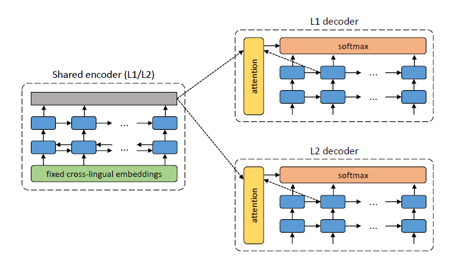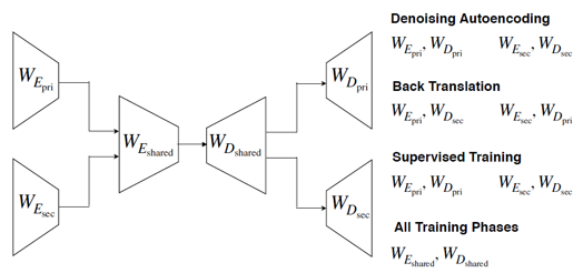 2) 去噪编码(预训练算法策略)采用 ‘UNSUPERVISED NEURALMACHINE TRANSLATION’一文类似的策略(如下图所示),通过共享编码,而后单语解码,可以实现对单语文本的重构(去噪)。与他们不同的是,本文作者在共享编码之前先对两种语言单独进行初编码,其次是作者使用 Transformer 替换 RNN 编码/解码。