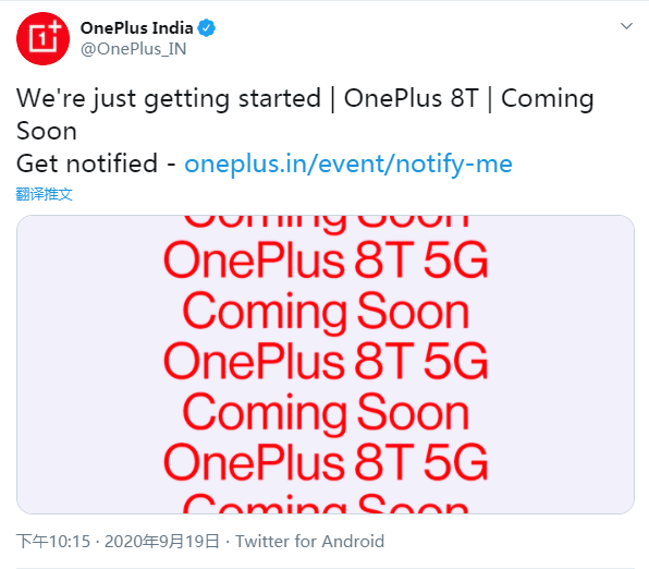 今天,一加印度官方推特为新旗舰一加8T预热,预告一加8T即将发布,具体时间尚未官宣。