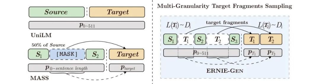 在构造预训练数据时,UniLM和MASS都采样一段连续的子序列作为生成目标,当输入序列很长时,由于目标序列较长,decoder端对encoder的依赖减弱,模型训练有退化为language model的风险,不利于encoder和decoder的联合预训练。对此ERNIE-GEN采用「多片段-多粒度采样」的策略来构造预训练数据: