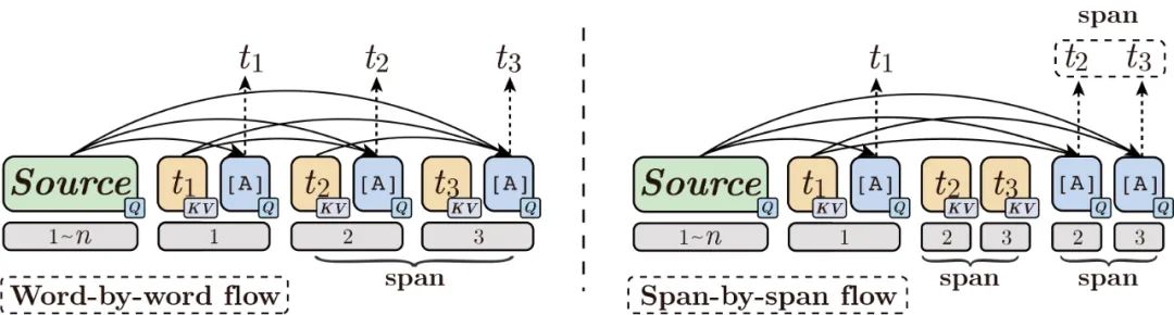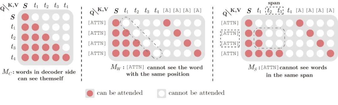 「Contextual Flow」中 是双向可见的, 是单向可见的 (seq2seq);而「Word-by-word Flow」中的符号序列 不能看见相同位置的目标字符;「Span-by-span Flow」中,符号序列 不能看见同一个span中的所有目标字符,如图中的 。