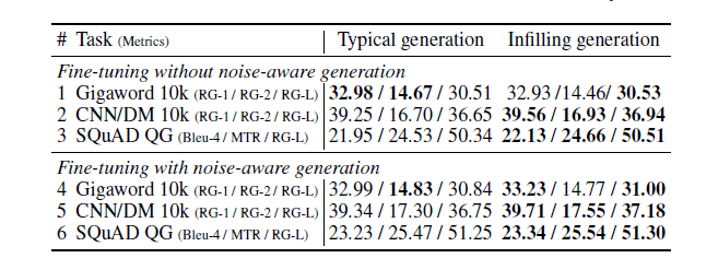 当finetune不加噪声时,Infilling generation机制在CNN/DM-10k和SQuAD上较传统机制更好,但在Gigaword-10k上持平;当finetune加入噪声时,两种生成机制的效果都有明显的提升,且infilling机制在摘要生成任务上的涨幅为明显。