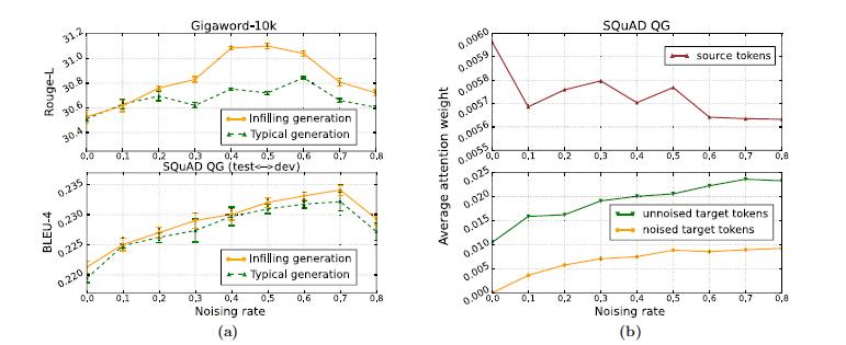 左图指出,infilling generation机制在不同的噪声 比例下,都较传统生成机制性能更好;为了进一步说明噪声对生成训练起的作用,论文中分析了不同噪声比例下,比较了encoder字符、未加噪的decoder字符和加噪的decoder字符在最后一层的平均attention权重。有意思的是,随着噪声比例增加,模型将更多的注意力分配到decoder端,用于检测decoder端的错误,并且给错误的字符分配更小的权重,给正确的字符分配更高的权重,从而增加了生成的鲁棒性。