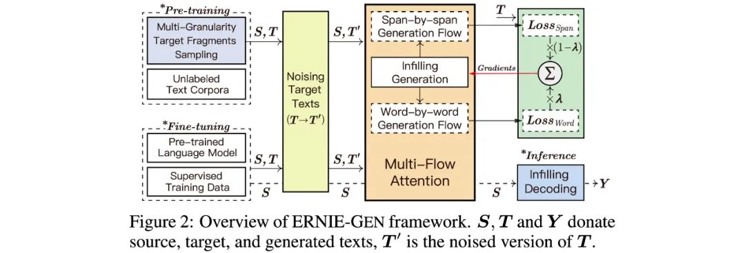 针对以上3个问题,ERNIE-GEN提出一套基于Multi-Flow attention结构的预训练和微调框架:
