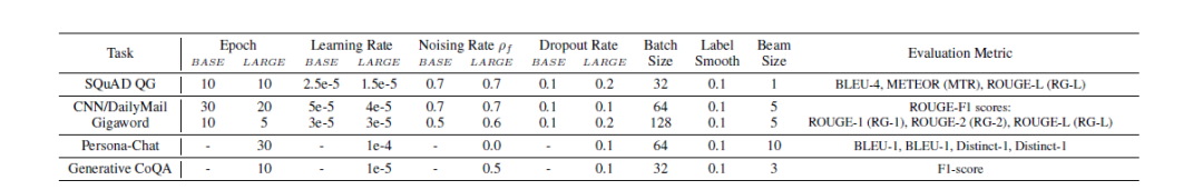ERNIE-GEN使用和BERT、UnilM相同的训练数据(16G),base和large模型分别用BERT-base和BERT-large热启,训练40W步左右。预训练阶段,在decoder输入序列中加入比例为 的噪声。ERNIE-GEN在最近补充了用160G预训练数据(同Roberta)下的模型性能,多个生成数据集上取得了SOTA。