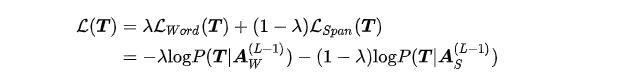 其中 表示 l-th层,符号序列 的 第 个隐层向量,也即第 个span的第 个隐层向量, 。片段 是在给定上文时,同时预测的。