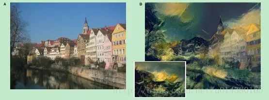 在开始介绍文章算法之前,先看看什么是图像风格迁移?如下图:A是待转换的图像,小的矩形图像是风格图像,B是转换后的图像。
