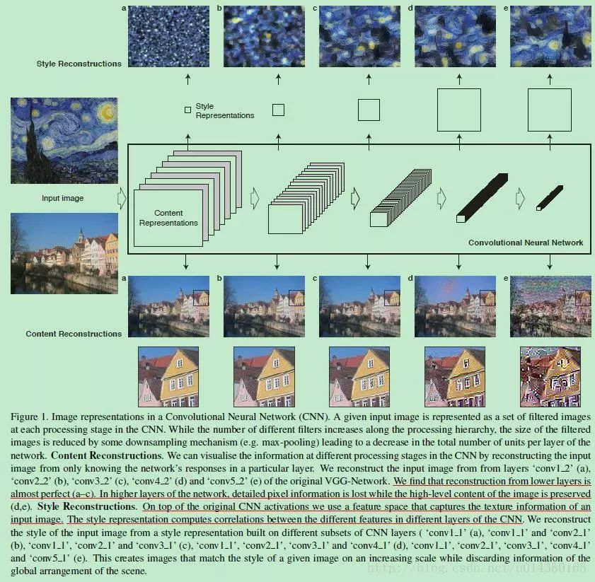 Fgiure1介绍了后面要用到的一个很重要的观点(主要根据Figure1最下面的content reconstructions 结果):网络的高层特征一般是关于输入图像的物体和布局等信息,低层特征一般表达输入图像的像素信息。也就是说在提取content特征时,不同层的表达效果是不一样的,本文在后面提取图像的content特征时采用高层特征。另一个点,从Figure1最上面的style reconstructions可以看出,不同层的特征表达有不同的视觉效果,因此在后面提取style feature map的时候采用的是多层特征的融合,这样风格表达会更加丰富。