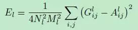 这里的l表示层,i和j表示该层的第i个feature map和第j个feature map,k表示feature map的第k个元素,因此这个公式就是对两个feature map求内积。为什么会引入Gram矩阵呢?其实就是为了表达图像的纹理特征(content representation)。有一种说法是图像的纹理特征和位置是没有关系的,Gram矩阵这种求两个feature map内积的结果也是和位置没有关系的,因此可以用来度量纹理特征。后来看的一些图像风格迁移的文章也挺多是对如何描述纹理相似方面入手。