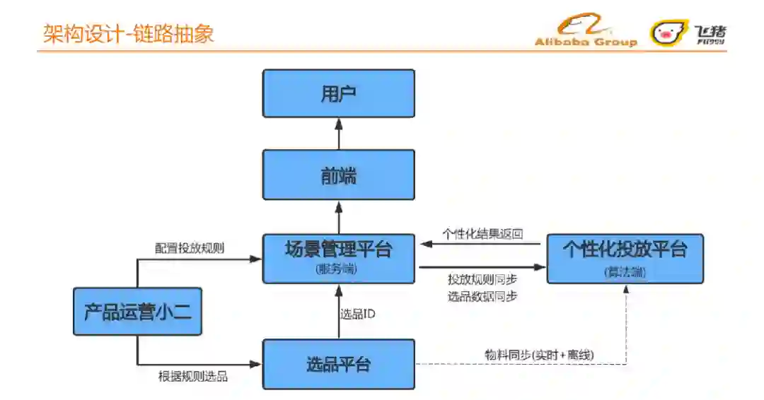我们将链路抽象为6个模块:产品运行端、选品平台、场景管理平台、个性化投放平台、前端、用户。