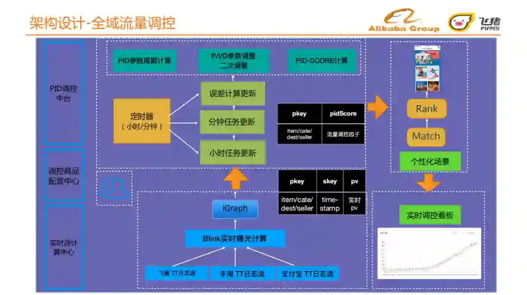 全域流量调控过程如图所示,从最底层往上依次是:实时流计算中心、调控商品配置中心、 PID调控中台 。
