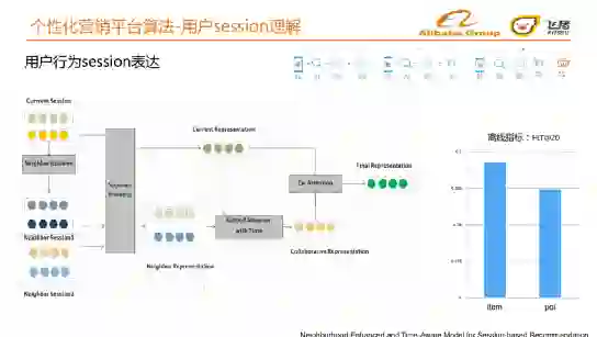基于上节介绍的用户行为session中的节点向量表达,我们进而构建用户行为session的表达[3]。我们首先检索与当前session有协同信息的邻居session。邻居检索:根据当前session有哪些item,粗筛出有相同item的session,再根据最大覆盖原则选出自身有多个item和当前session相同的邻居session。