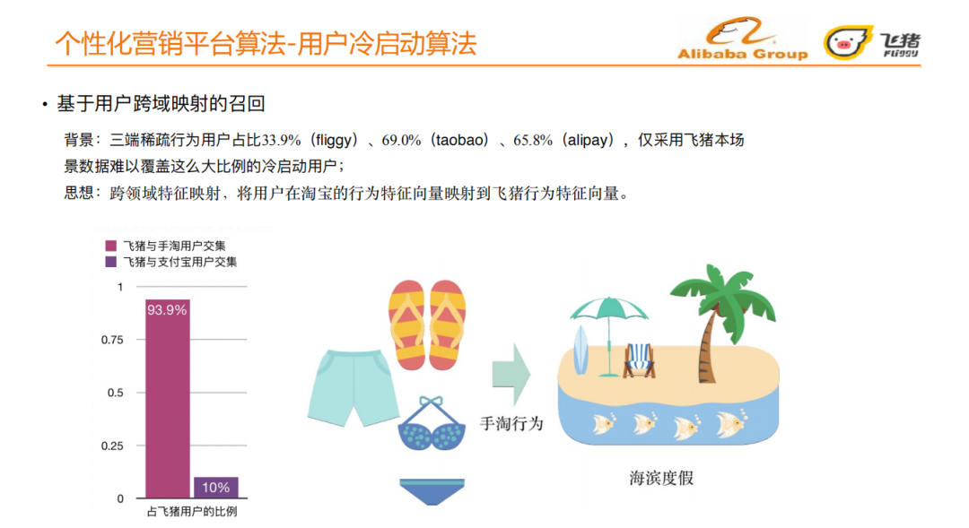手淘端的部分宝贝行为和航旅宝贝具有一定的关联性,如一个用户近期在手淘端有沙滩鞋、沙滩裤、泳装等行为,我们认为该用户可能有海滨度假的需求,当他来到飞猪端时,我们就给他投放相应的宝贝。