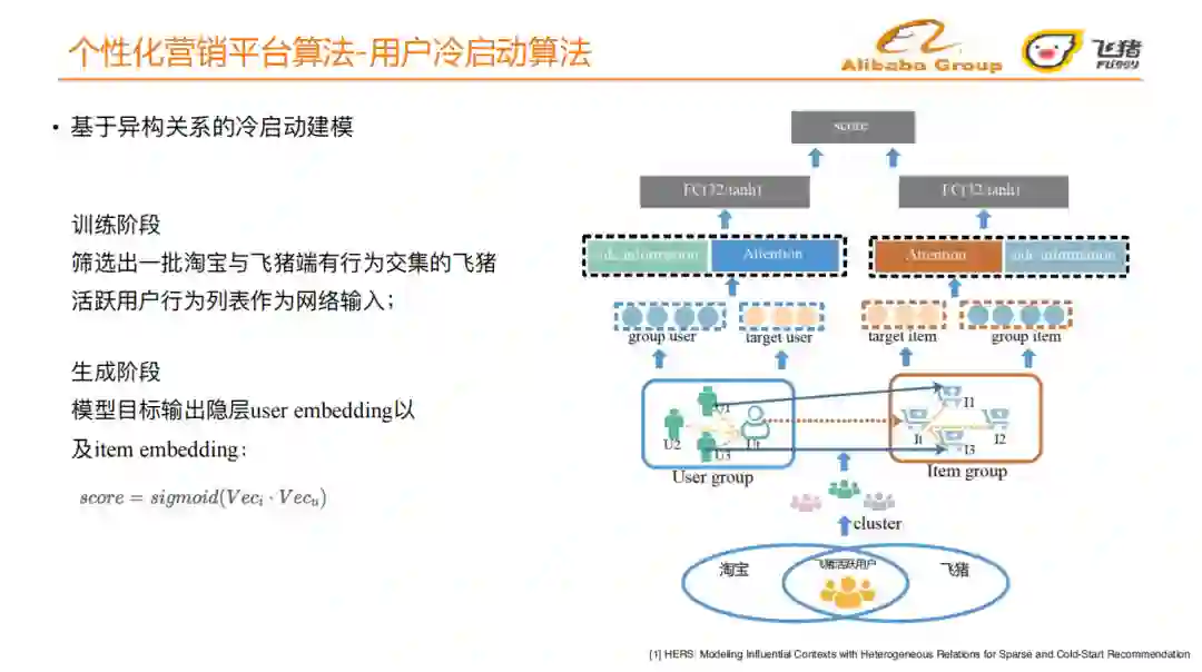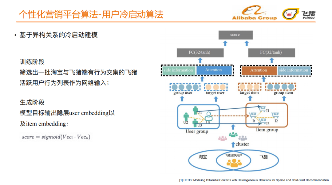 筛选出一批淘宝和飞猪双端的活跃用户,将活跃用户在淘宝端的用户行为序列和LBS信息通过聚类得到user group;将user group最近行为过的历史宝贝和目标宝贝组成一个item group,通过这种方式引入了用户与用户、用户与宝贝以及宝贝与宝贝之间的异构关系;分别将这两个group输入attention网络中,学习目标用户和user group之间的相似度,目标宝贝和item group之间的相似度,再分别加上用户侧的side information以及宝贝侧的side information;再分别经过一个全连接网络,得到user embedding和item embedding;最后计算embedding向量之间的相似度。