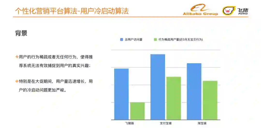 我们将近最近3月没有任何行为的用户划分为冷启动用户 ,冷启动用户在飞猪、淘宝、支付宝三端占比都很高。用户的行为稀疏或者无任何行为,使得推荐系统无法有效捕捉到用户的真实兴趣,特别是在大促期间,用户量迅速增长,用户的冷启动问题更加严峻。