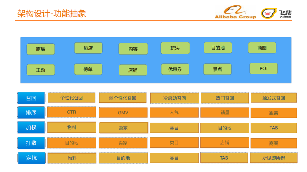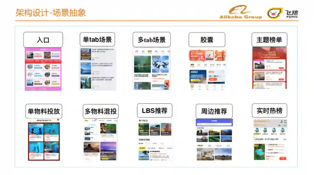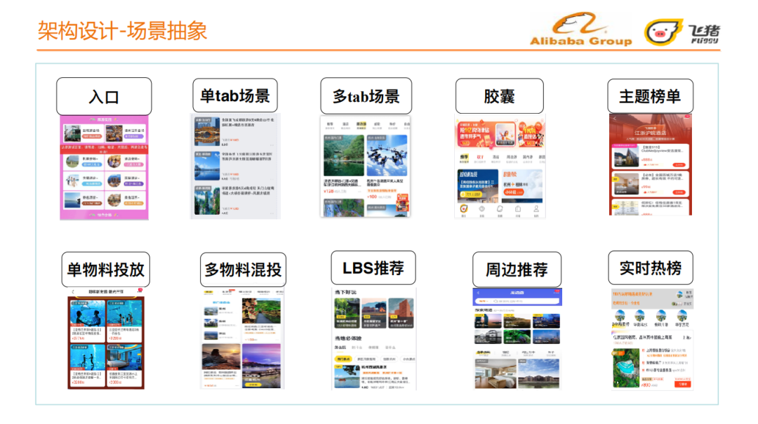 我们首先对上节讲到的日常场景和会场场景进行场景抽象,抽象出的场景包括:入口、单Tab场景、多Tab场景、胶囊、主题榜单、单物料投放、多物料混投、LBS推荐、周边推荐和实时热榜等。