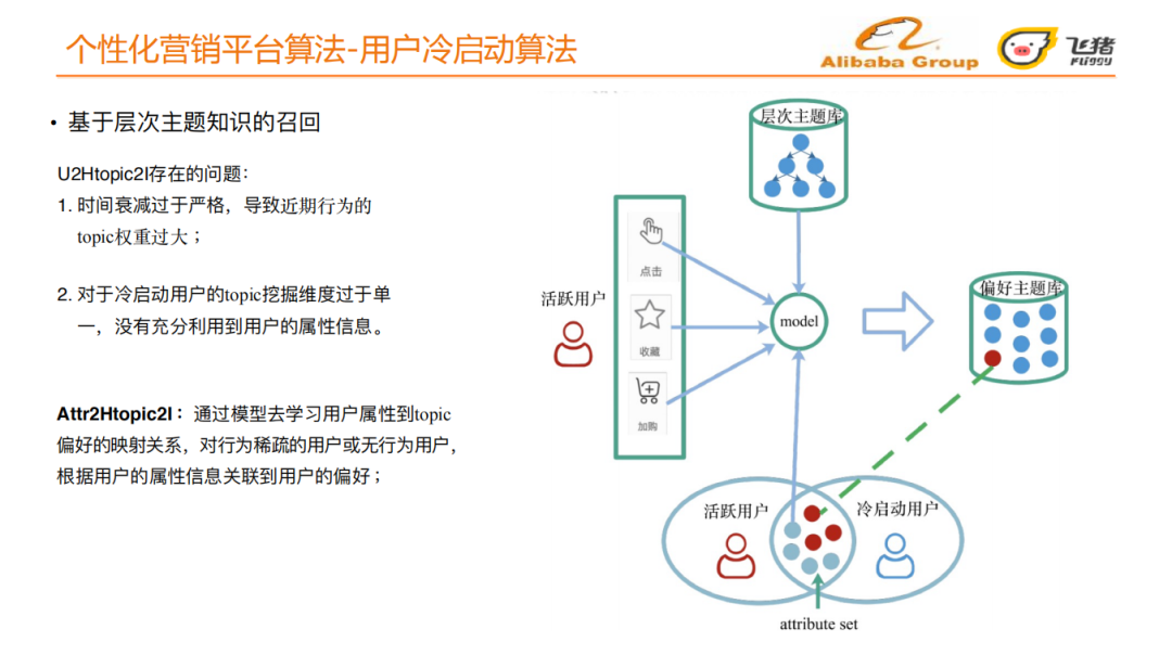 Attr2Htopic2I同样是选取一批飞猪活跃用户,与U2Htopic2I不同在于,通过模型去预测历史活跃用户对层次主题的偏好。通过冷启动用户的属性集,将其映射到偏好主题库上,从而召回用户可能感兴趣的宝贝。
