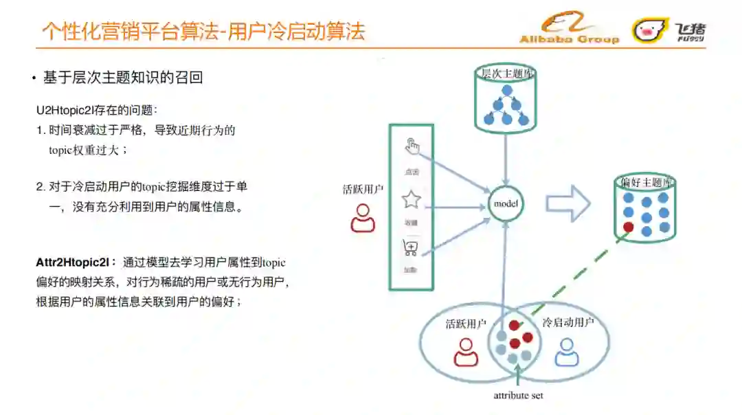 我们据此提出Attr2Htopic2I:通过模型去学习⽤户属性到topic偏好的映射关系,对⾏为稀疏的⽤户或⽆⾏为⽤户, 根据⽤户的属性信息关联到⽤户的偏好。