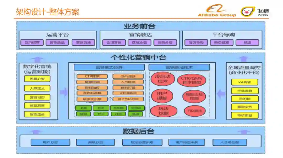 整体方案集成如图所示,从最底层往上依次是:数据后台、个性化营销中台、业务前台。