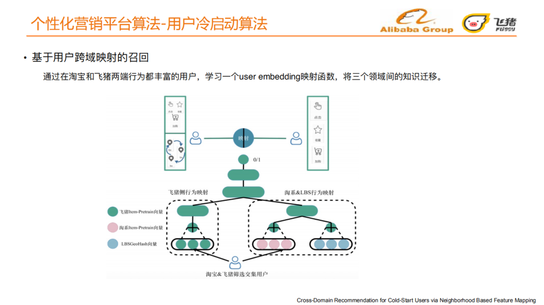 思想:跨领域特征映射,将⽤户在淘宝的⾏为特征向量映射到飞猪⾏为特征向量。