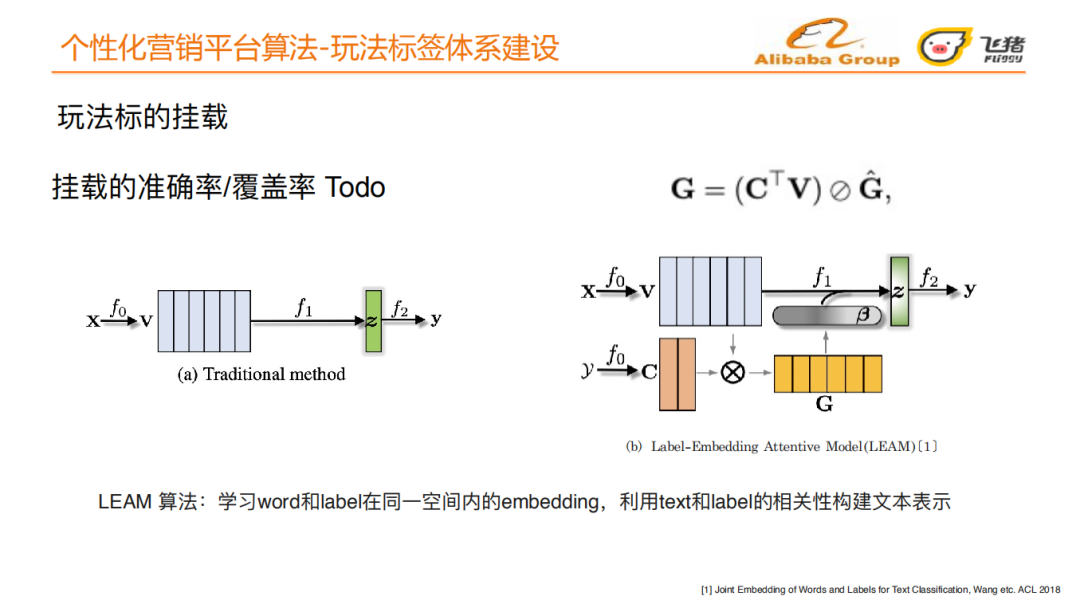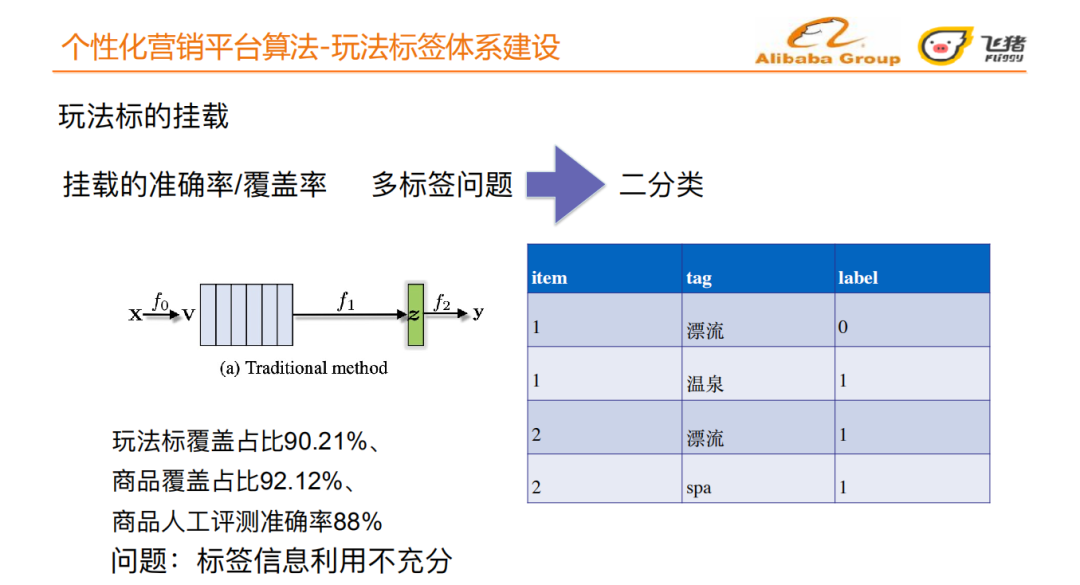 在构建好玩法标签树之后,我们需要将标签准确的挂载到宝贝之上。一个宝贝可以拥有多个玩法标签,玩法标签挂载本质上是一个多标签问题,我们将其拆解为多个二分类问题。飞猪团队最初采取传统的机器学习方法。我们取得了玩法标覆盖占⽐90.21%、 商品覆盖占⽐92.12%、 商品⼈⼯评测准确率88%的结果。传统方法存在标签信息利用不充分的问题,人工评测准确率依然有可提高的空间。