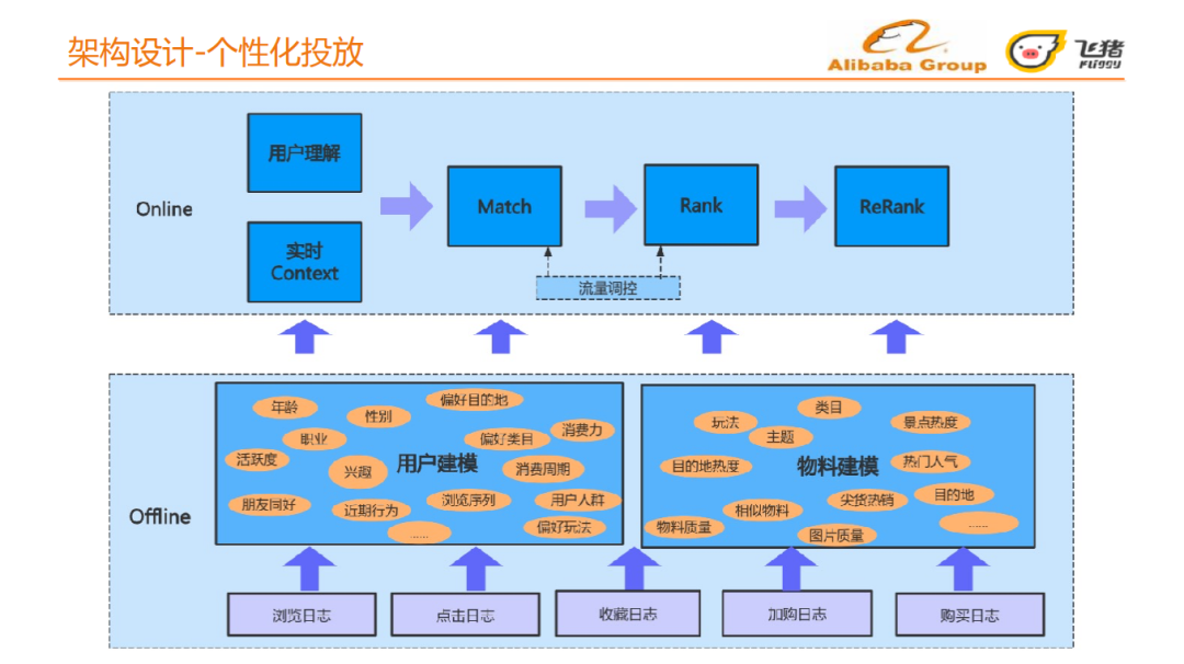 在线处理首先进行用户理解和实时的上下文分析,目的是更精准的人货实时匹配,即个性化召回。物料召回后平台会进行匹配和排序,匹配和排序之间会有流量调控,目的是对新品 、爆款、尖货等给予一定的扶持。排序结果会结合运营的投放规则进行更加精准的重排序最终呈现给用户。