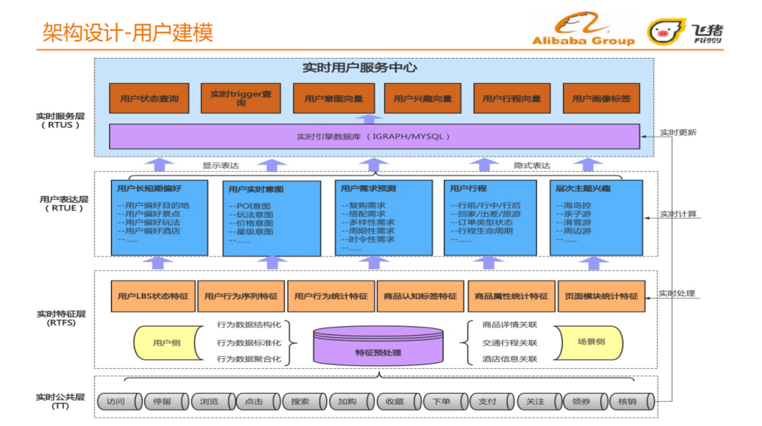 用户表达层:基于实时特征层的原始特征进行加工、提纯、聚合,生产用户的特征表达,包括:用户长短期偏好、用户实时意图、用户需求预测、用户行程、层次主题兴趣;
