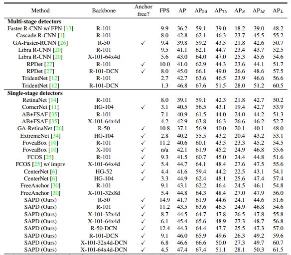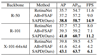 作者和FSAF(基于anchor-free分支)进行比较,soft-weighted anchor points(SW)策略提升了1.1个点,soft-selected pyramid levels(SS)提升了1个点。作者还采用了BFPN(2019 CVPR Libra RCNN中的特征融合策略)进行了加强,还能有性能提升。