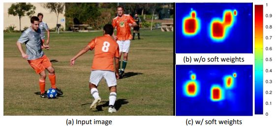 上图中有五个足球运动员,分类输出的得分图score map如图b所示,可以看到有两个运动员的得分区域占了主导地位。甚至这两个运动员的得分区域还侵占了其他运动员的得分区域。