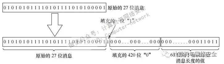 再在最后用64位来表示原始消息长度“27”,得到用于标识原始消息长度的64位值为:000......00(前面一共有59位“0”)11011。