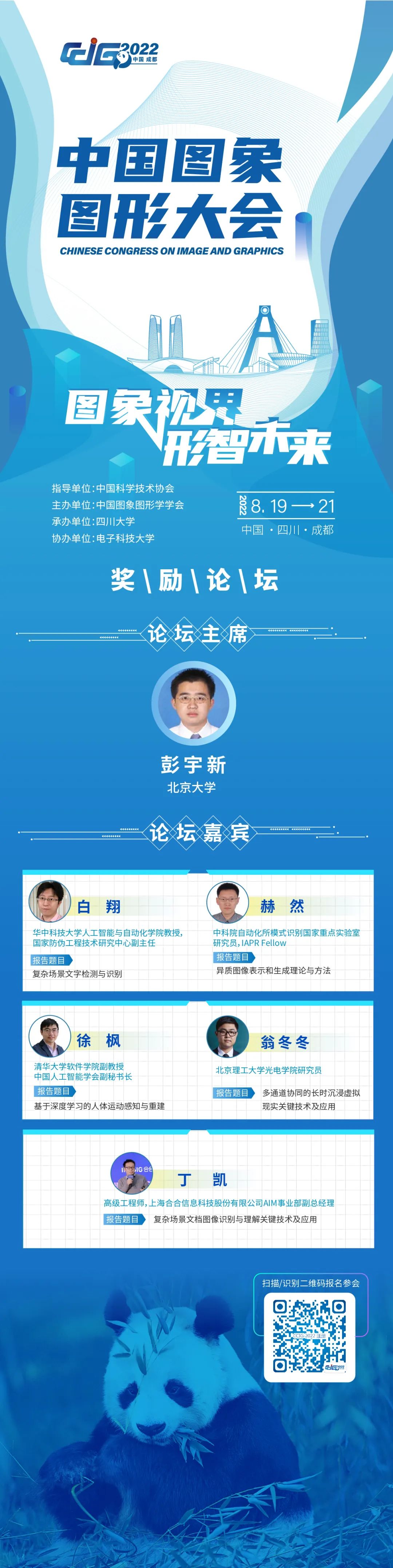 中国图象图形大会(CCIG 2022)将于2022年8月19-21日在成都盛大举办,大会以“图象视界,形智未来”为主题,由中国图象图形学学会主办、四川大学承办、电子科技大学协办。