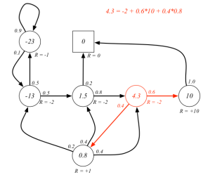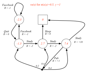 下图已经给出了γ=1时各状态的价值(该图没有文字说明γ=1,根据视频讲解和前面图示以及状态方程的要求,γ必须要确定才能计算),状态 的价值可以通过状态Pub和Pass的价值以及他们之间的状态转移概率来计算:
