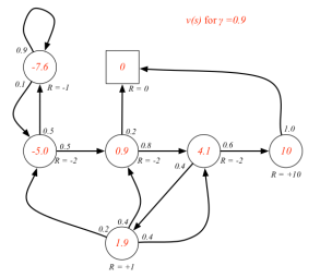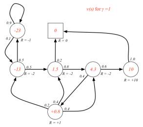 各状态圈内的数字表示该状态的价值,圈外的R=-2等表示的是该状态的即时奖励。