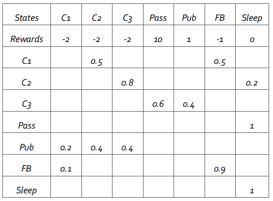 为方便计算,把“学生马尔科夫奖励过程”示例图表示成下表的形式。表中第二行对应各状态的即时奖励值,蓝色区域数字为状态转移概率,表示为从所在行状态转移到所在列状态的概率:
