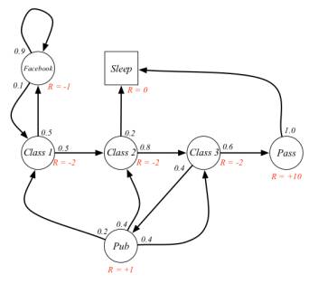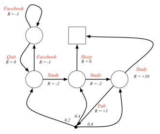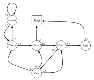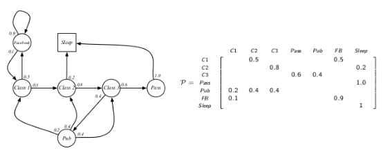 图中,圆圈表示学生所处的状态,方格Sleep是一个终止状态,或者可以描述成自循环的状态,也就是Sleep状态的下一个状态100%的几率还是自己。箭头表示状态之间的转移,箭头上的数字表示当前转移的概率。