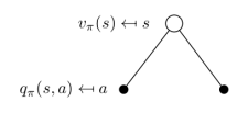 上图中,空心较大圆圈表示状态,黑色实心小圆表示的是动作本身,连接状态和动作的线条仅仅把该状态以及该状态下可以采取的行为关联起来。可以看出,在遵循策略π时,状态s的价值体现为在该状态下遵循某一策略而采取所有可能行为的价值按行为发生概率的乘积求和。