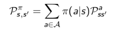 用文字描述是这样的,在执行策略 时,状态从s转移至 s' 的概率等于一系列概率的和,这一系列概率指的是在执行当前策略时,执行某一个行为的概率与该行为能使状态从s转移至s’的概率的乘积。