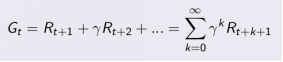 为在一个马尔科夫奖励链上从t时刻开始往后所有的奖励的有衰减的总和。也有翻译成“收益”或"回报"。公式如下: