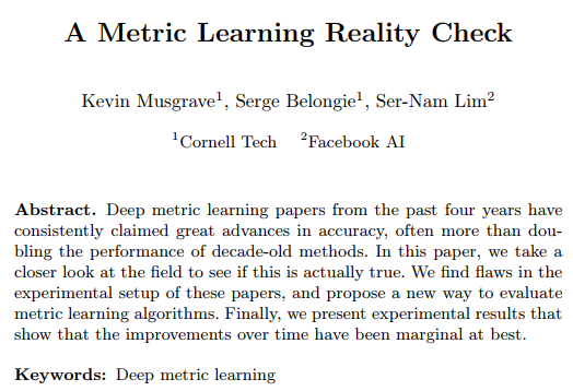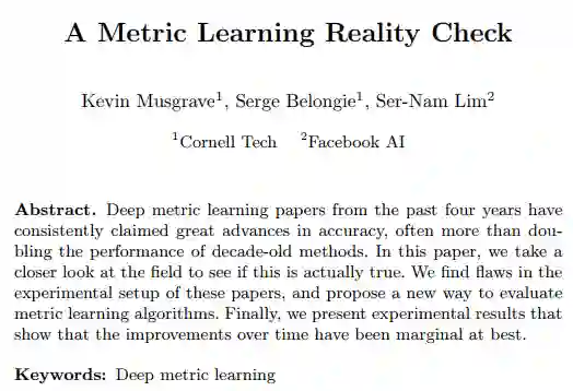 对深度度量学习进行分析的文章来自Facebook AI 和 Cornell Tech 的研究人员,他们发表研究论文预览文稿标题为“A Metric Learning Reality Check”。