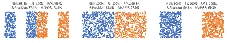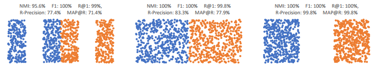 为了体现准确性,大多数度量学习论文都会报告Recall@K、归一化相互信息(NMI)和F1分数。但这些一定是最好的衡量标准吗?如下图三个嵌入空间,每一个recall@1指标评价都接近满分,而事实上,他们之间的特征并不相同。此外,F1和NMI分数也接近,这在一定程度上说明,其实,这几个指标并没带来啥信息。