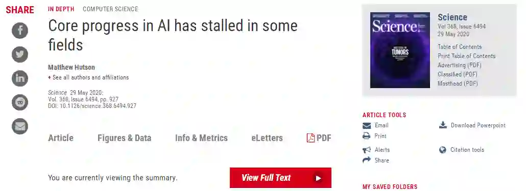 5月29日,Science刊登了一篇标题为“人工智能某些领域的核心进展一直停滞不前”的文章,在文章里,作者Matthew Hutson提到:一些多年之前的“老算法”如果经过微调,其性能足以匹敌当前的SOTA。