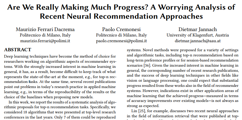 对神经网络推荐算法进行分析的论文是 “ Are We Really Making Much Progress? A Worrying Analysis of Recent Neural Recommendation Approaches ”,作者是来自意大利米兰理工大学的研究员。
