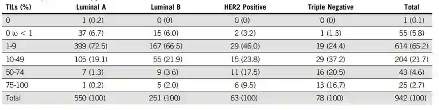 乳腺癌亚型和TIL的分布见表1。luminal A型肿瘤占58%,侵袭性更强的肿瘤,即三阴性和HER2阳性患者共占15%。总体而言,71%的患者,TIL小于10%。相对而言,luminal型肿瘤的TIL评分更低,79%的luminal A型肿瘤TIL<10%,luminal B型肿瘤与之相似,占73%。相反, HER2阳性肿瘤和三阴性患者,TIL<10%的患者分布占49%和26%。放疗组和非放疗组患者的TIL分布相似。