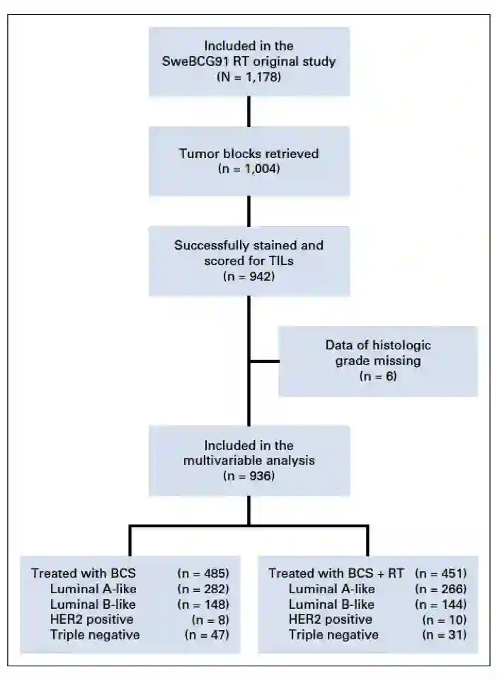 研究纳入SweBCG91RT研究中的乳腺癌患者进行分析。这一研究中入组了1178例淋巴结阴性(N0)的Ⅰ期或ⅡA期患者,在保乳术后随机分配接受或不接受全乳放疗。根据2013年St. Gallen国际乳腺癌大会共识对患者进行分型:luminal A型(ER和/或PR阳性,HER2阴性,Ki-67低),luminal B型(ER和/或PR阴性,HER2阴性,Ki-67高),HER2阳性(HER2阳性,ER或PR任意表达状态,Ki-67任意评分)和三阴性(ER阴性,PR阴性,HER2阴性,Ki-67任意评分)。鉴于HER2阳性和三阴性患者人数较少,将这两类患者合并分析,纳入非luminal组。研究共成功检测了942例患者的TIL(图1)。TIL的评估根据国际免疫生物标志物工作小组的建议进行,研究采用半连续变量进行分组:<1%,1%~9%、10%~49%、50%~74%和≥75%。