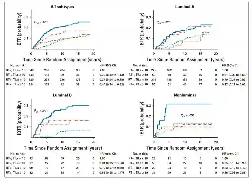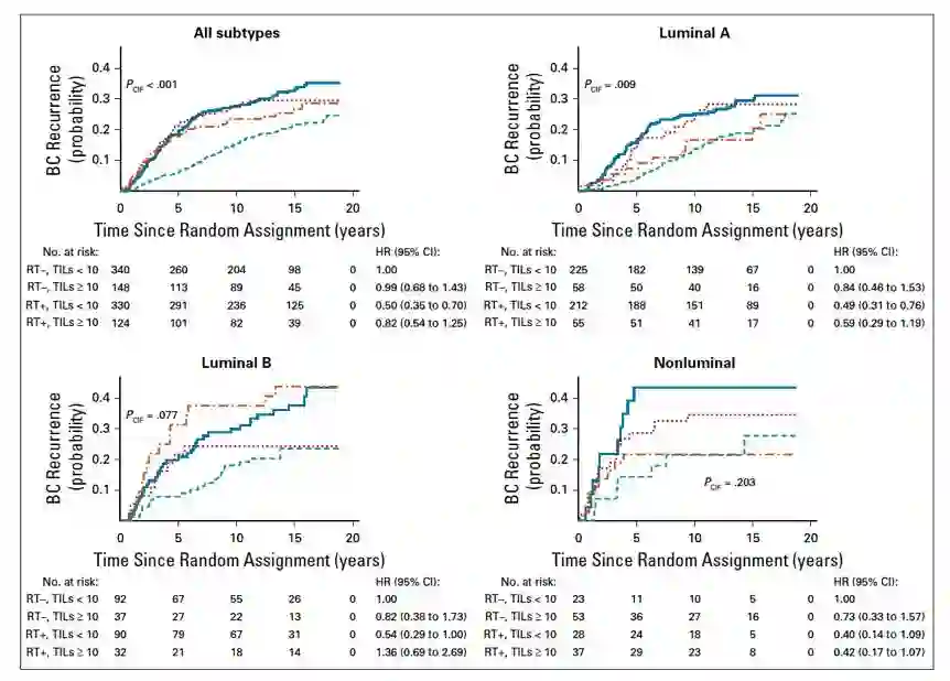 这一研究结果显示,原发肿瘤高TIL预示着患者同侧乳腺癌复发风险更低。而对于TIL低的乳腺癌患者,接受放疗后,同侧乳腺癌复发风险下降更为显著。