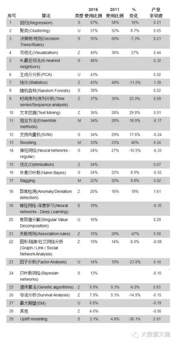 表4:KDnuggets 2016 调研:数据科学家使用的算法