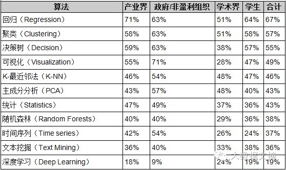 不同职业类型最常用的10大算法+深度学习情况