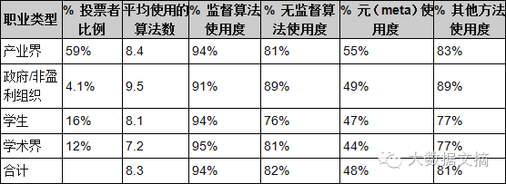 下面的表格显示了不同的算法类型的使用场所:监督算法,无监督算法,元算法和其它算法。应用类型未知(NA,4.5%)或者其它职业类型(3%)的不包括在内。