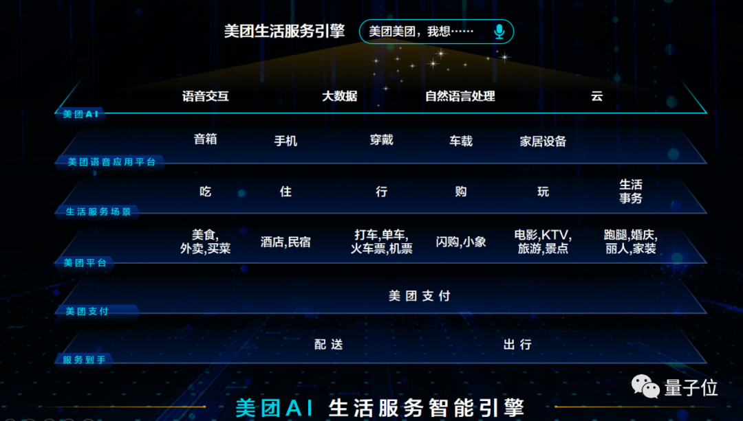 最具代表性的,莫过于美团在去年开始对外发布美团语音能力,其结合“智能交互”技术打造的服务引擎,已经成为美团AI应用中最广泛的产品之一。
