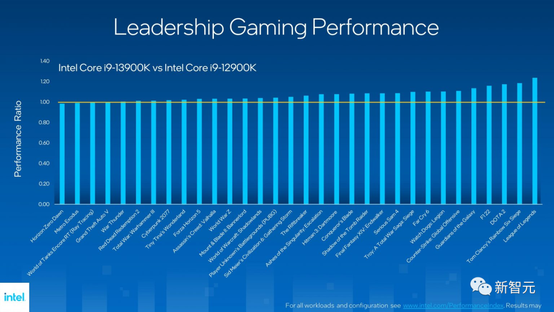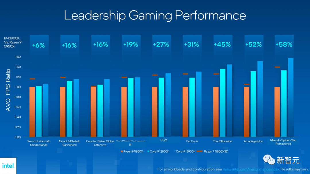 游戏性能方面,英特尔把5000系锐龙旗舰5950X拿出来做了背景板。